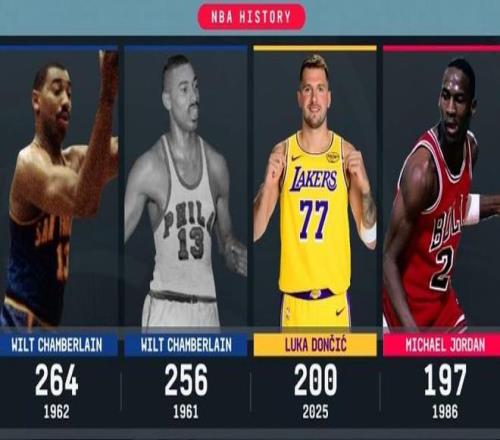 第3、本赛季的前五场比赛中,东契奇合计得到200分,历史第三高,仅次于张伯伦(第1和第二都是张伯伦)。