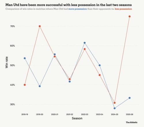 数据揭示,在阿莫林麾下,曼联在英超比赛中控球率较低时,往往能取得更好的结果。